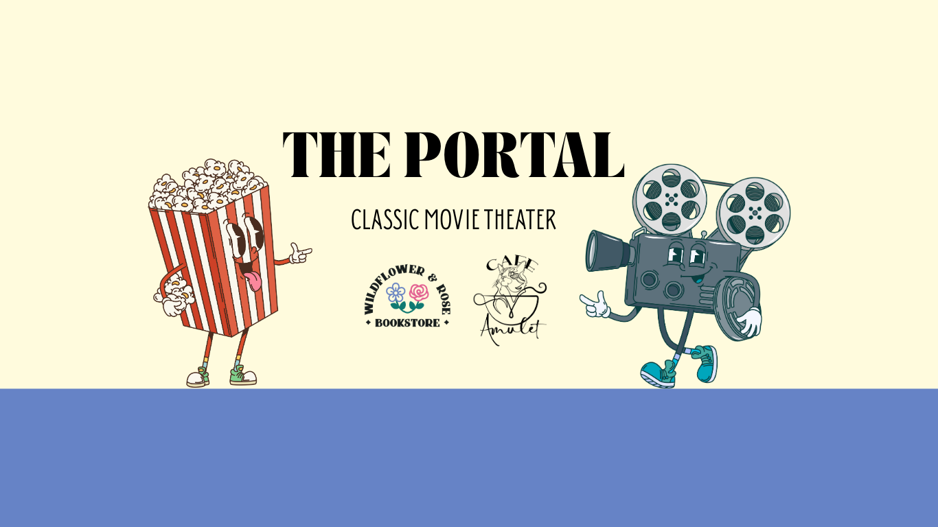 The Portal is a classic movie theater showing public domain movies on select Thursdays and Fridays at 7:00 pm in Martha’s Ballroom (the upper level of Café Amulet). Showings will start in October 2025.